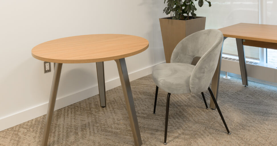 Private offices were designed as tailored, user-specific environments, balancing individual work styles with functional needs. While most spaces were oriented toward floor-to-ceiling windows to maximize natural light, layouts were thoughtfully adapted to accommodate both contemporary and more traditional configurations. A combination of Metro Executive, Halifax, and Cosmo product lines allowed each office to be customized while maintaining a unified design language throughout. Layered applications of worksurfaces, returns, and storage create highly functional work zones, supported by flexible elements such as Koko laptop tables for both employees and guests. Halifax A-leg tables introduce additional meeting and touchdown surfaces, while larger offices incorporate expanded storage, integrated meeting points, and the ability to support future height-adjustable applications.