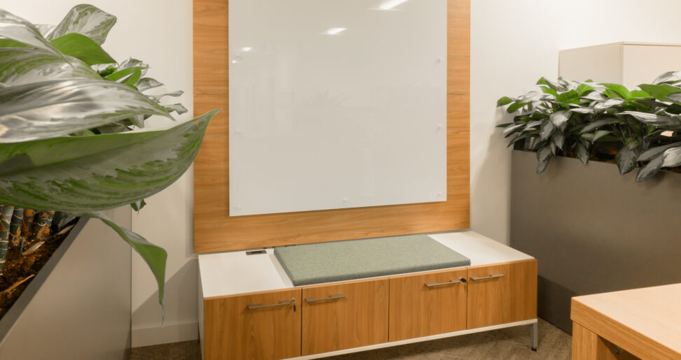 To maintain organization without adding visual weight, particularly important in a highly visible space, vertical solutions were integrated throughout. Gallery Wall systems, floating shelves, and storage components provide efficient organization while reinforcing a clean, architectural aesthetic. Wall-mounted glass whiteboards and Echo PET tackboards enhance functionality for collaboration and planning, while also contributing to improved acoustics.