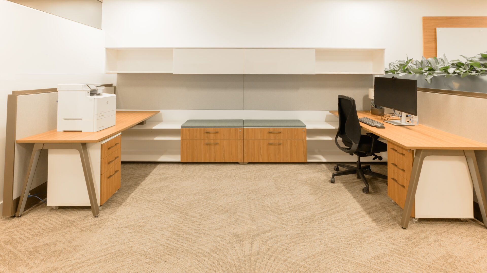 Together, these solutions are unified through a consistent material palette of warm Kiss Curl laminate paired with Ginger and Silver metal accents, creating a workplace that feels both elevated and cohesive while remaining adaptable for future needs.