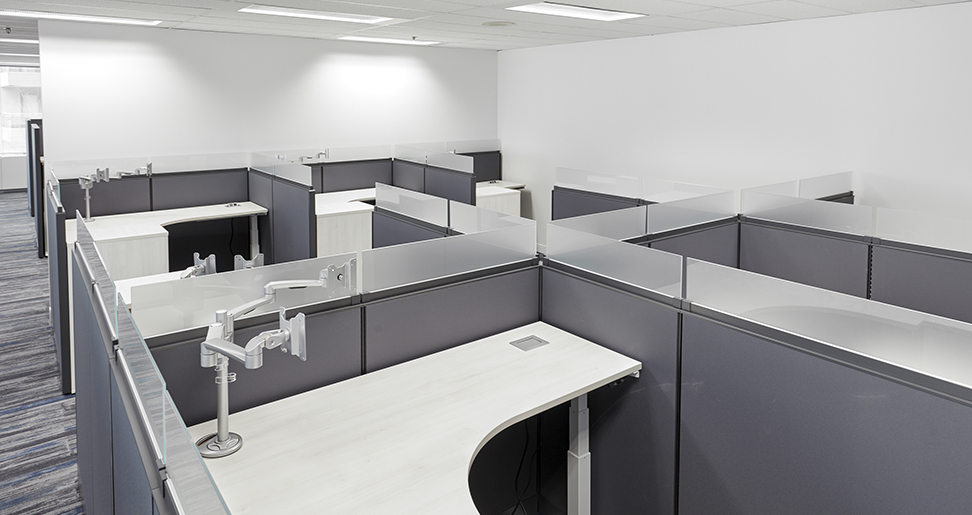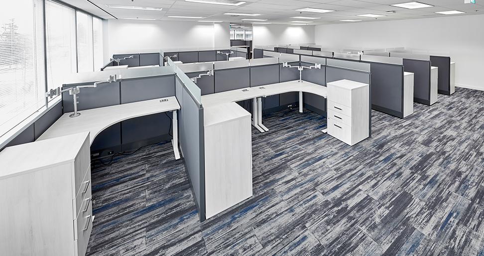 Each station was outfitted with Steel Grey fabric panels which seamlessly blends in with the Charcoal metal trim and raceway. The Height Adjustable Tables and storage towers were finished in Fogo Harbour laminate with Silver grommets and handles providing a subtle contrast. To finish each station, panel mounted Frosted Glass was added for extra privacy, while allowing plenty of natural light to flow through.